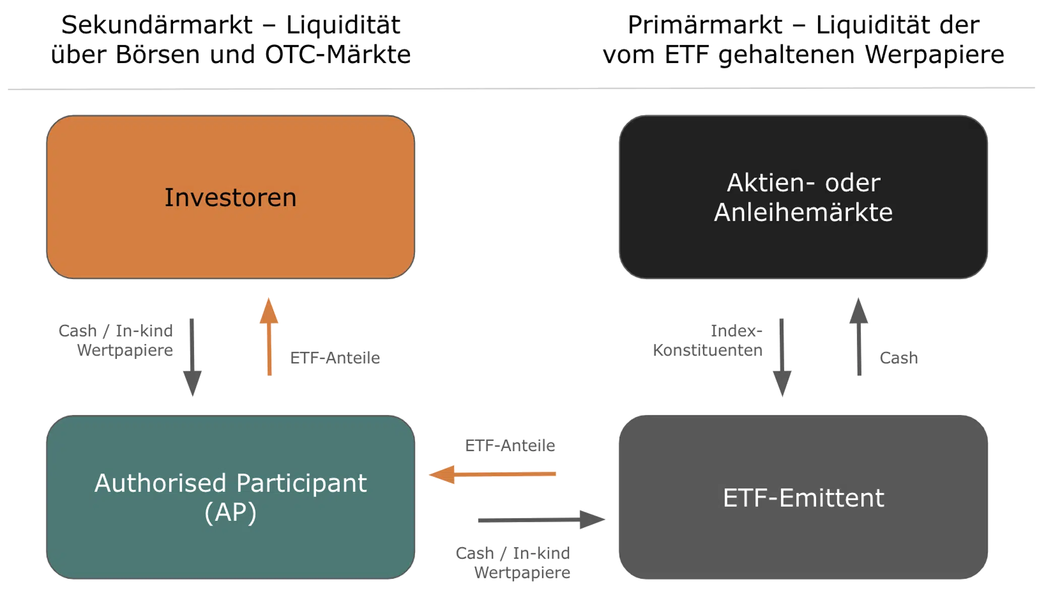 Sie können Aktive ETFs wie gewohnt über die Börse oder den OTC-Markt handeln. Die Liquidität beim Handel bemisst sich auch bei aktiven ETFs vor allem an der Liquidität der einem ETF zugrundeliegenden Wertpapiere. Etwa 20 bis 30 Prozent des ETF-Handelvolumens wird über Börsen abgewickelt. Der übrige Anteil ergibt sich aus dem Handel über OTC-Märkte (Over-the-counter). Authorisierte Marktteilnehmer stellen börsentäglich Liquidität zur Verfügung und können ein Ungleichgewicht aus Angebot und Nachfrage zum Ende des Tages ausgleichen, in dem sie neue ETF-Anteile beim Emittenten eines ETFs kreieren, oder alte Stücke an den ETF-Anbieter zurückgeben.