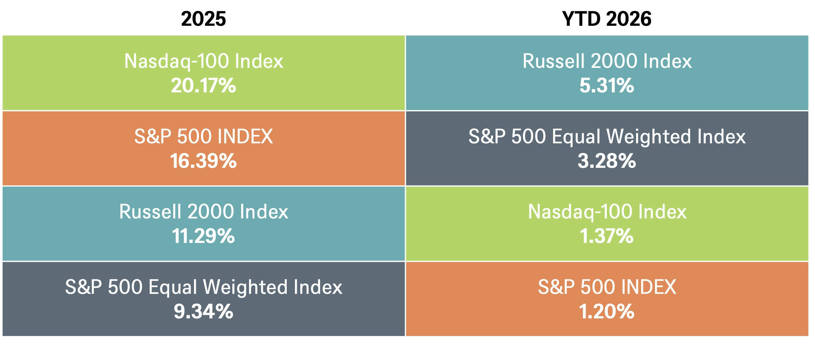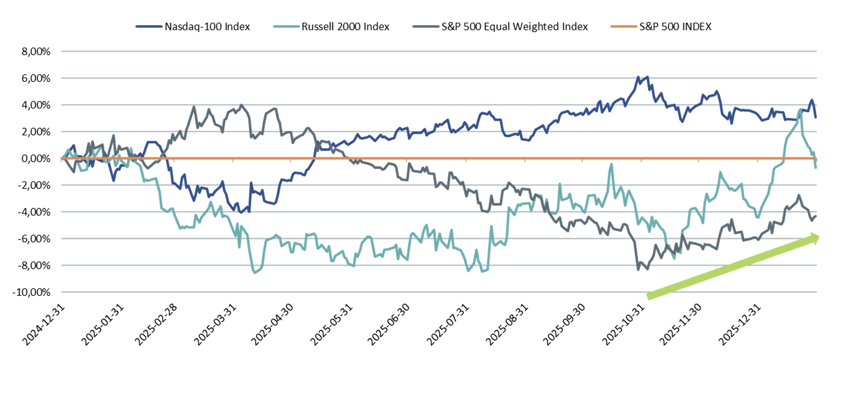 Quelle: DWS International GmbH, Bloomberg, Stand: 23.01.2026. Zeitraum: 31.12.2025 bis 30.01.2026. Die vergangene Wertentwicklung ist kein verlässlicher Indikator für zukünftige Erträge. Der S&P 500 INDEX bezieht sich auf den SPX Index, der S&P 500 Equal Weighted Index bezieht sich auf den SPW Index, der Russell 2000 Index bezieht sich auf den RTY Index und der Nasdaq 100 Index bezieht sich auf den NDX Index in Bloomberg.