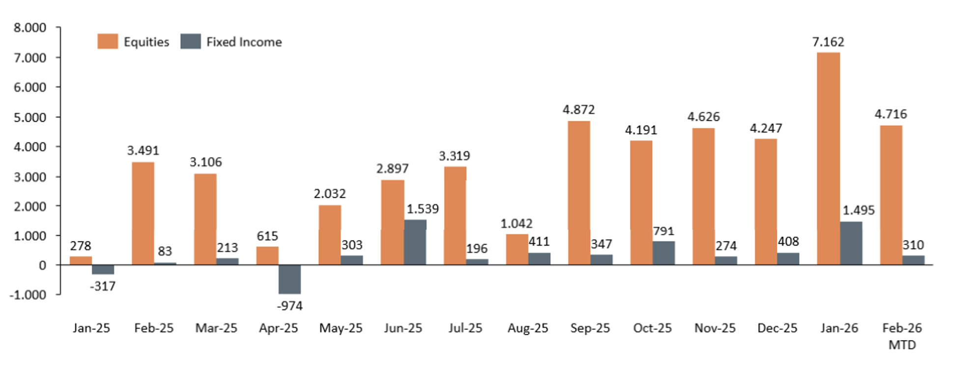 Abbildung 1: Monatliche Markt-NNA-Zuflüsse in Schwellenländer-Aktien- und Renten-UCITS-ETFs (in EUR)