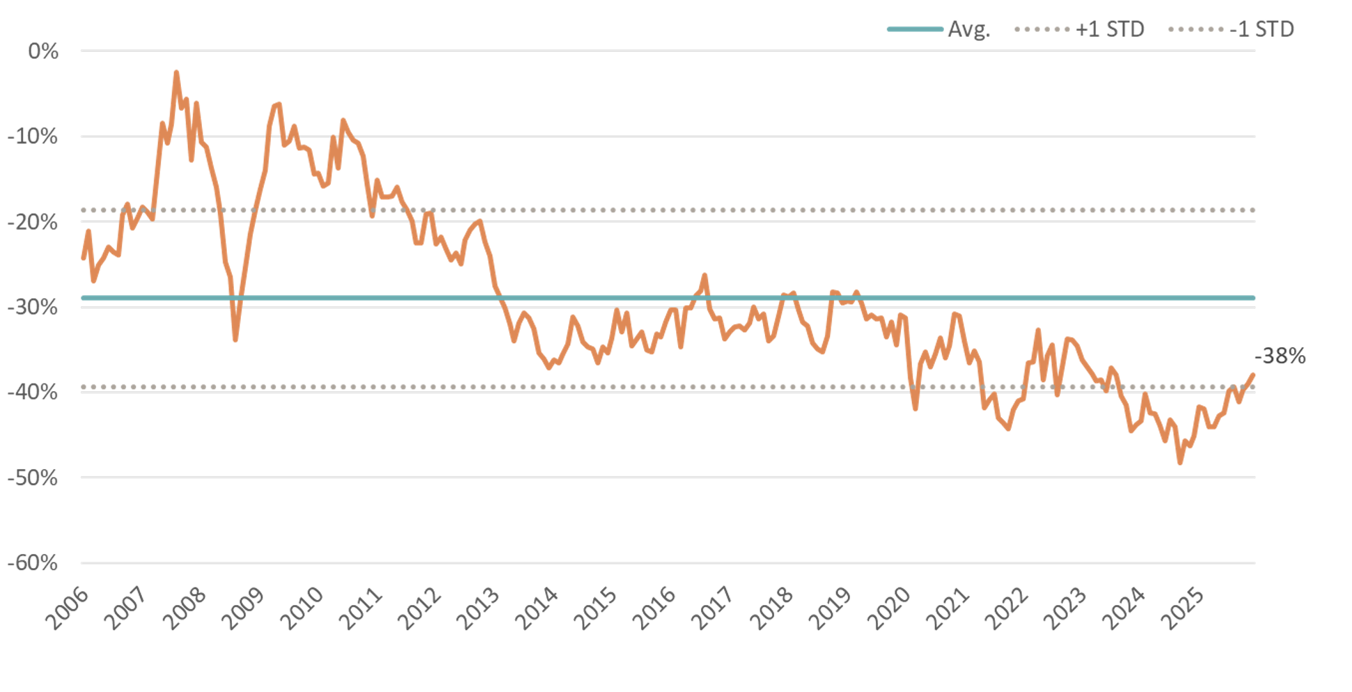 Beginnen wir mit dem greifbarsten Argument. Schwellenländer-Aktien werden weiterhin mit einem Forward-KGV-Abschlag von 38 Prozent gegenüber den US-Märkten gehandelt – nahe historischer Extremwerte (siehe Abbildung 2).[5]