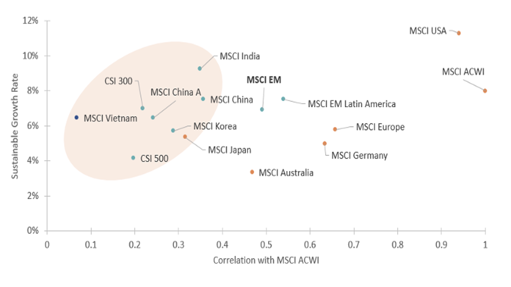 Abbildung 3: 5-Jahres-tägliche Korrelation gegenüber dem MSCI ACWI und 5-jährige nachhaltige Wachstumsrate