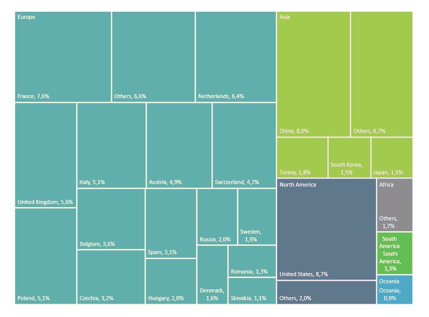 Deutschland gilt als vergleichsweise exportorientiertes Land – die Exporte sind in den letzten 20 Jahren stetig angestiegen. Die Deglobalisierung als Folge von Covid-19[7] in den letzten Jahren hatte dabei nur geringe Auswirkungen auf deutsche Exporte in den europäischen Binnenmarkt[8]. Hauptexportprodukte sind weiterhin Maschinen, Transportmittel und chemische Produkte[9].