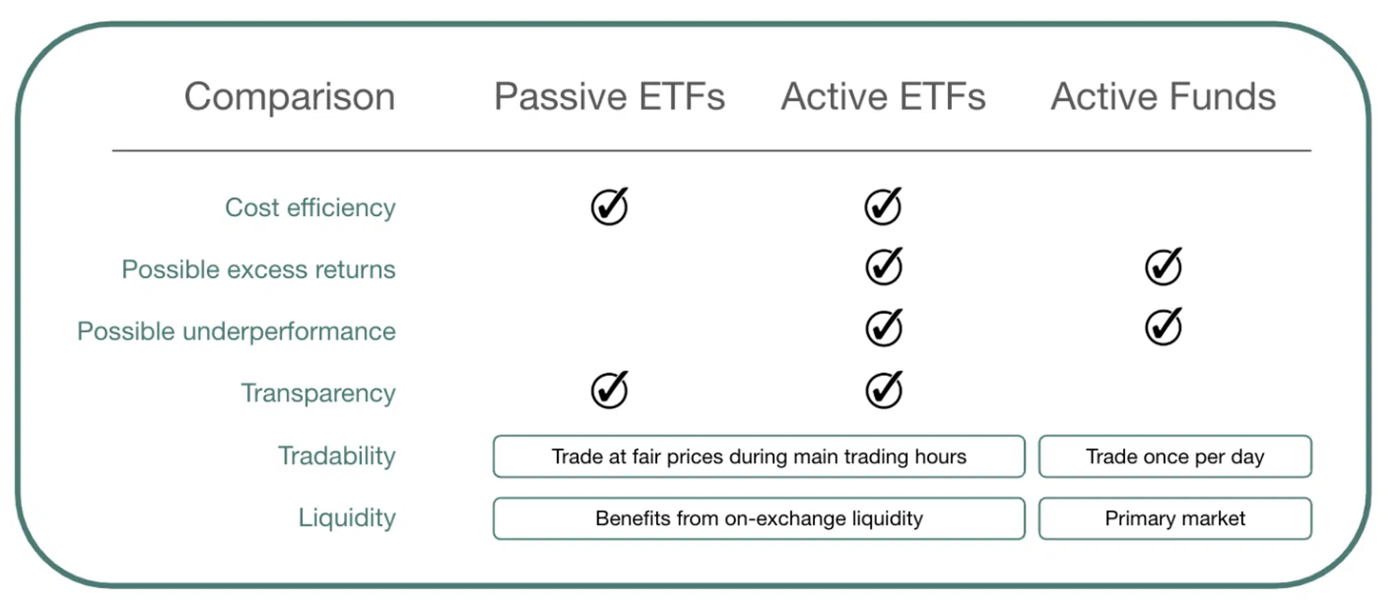 While passive ETFs replicate an index, active ETFs pursue strategies that aim to achieve excess returns in the market. A manager or team actively manages the portfolio to generate better returns – unlike passive ETFs, which aim to track a certain index as precisely as possible. However, the benefits of ETFs remain intact with active ETFs: they are cost-efficient, transparent, and can offer high liquidity, meaning they can be easily bought or sold without significantly affecting their price. They can be traded like stocks while simultaneously providing diversified[3], actively managed exposure to a specific market or strategy. By combining active management with the structural advantages of ETFs, active ETFs fill a gap in the investment landscape. They can offer you access to excess returns without having to sacrifice the familiar benefits, even though active management typically involves somewhat higher costs than passive ETFs.