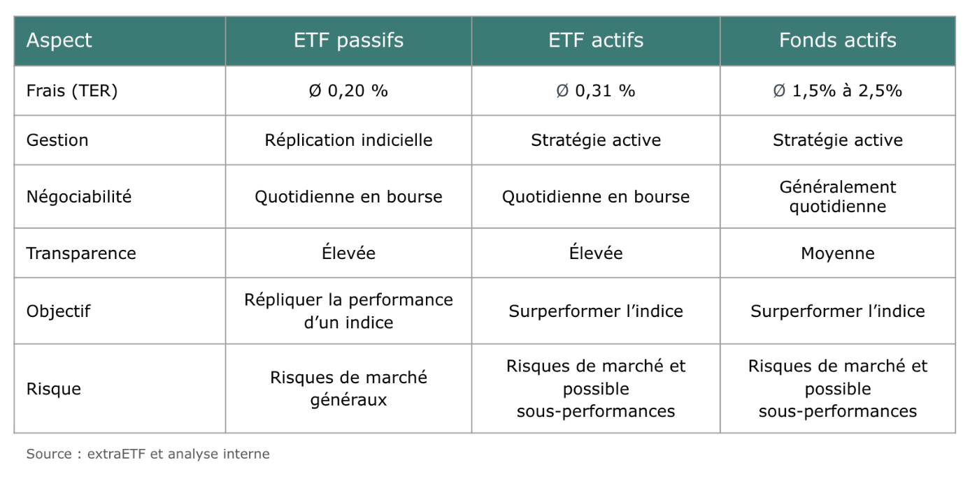 Historiquement, les ETF étaient conçus pour reproduire fidèlement la performance d’un indice de référence, comme le DAX ou le S&P 500. Les ETF actifs s’écartent de ce principe : leur objectif est de générer une surperformance par rapport au marché. Un gérant ou une équipe prend donc des décisions actives, avec le risque assumé d’une sous-performance – la différence majeure avec les ETF passifs. En revanche, les caractéristiques clés qui font le succès des ETF restent inchangées : structure de coûts efficace, transparence sur les positions et négociation en continu. Selon une étude récente, 41 % des investisseurs allemands détiennent déjà des ETF actifs, et 34 % envisagent d’y investir prochainement. Cette dynamique serait portée par la volonté d’accéder à une gestion active à moindre coût – mais aussi par d’autres facteurs. Le tableau ci-dessous montre les principales différences entre les ETF passifs, les ETF actifs et les fonds actifs :