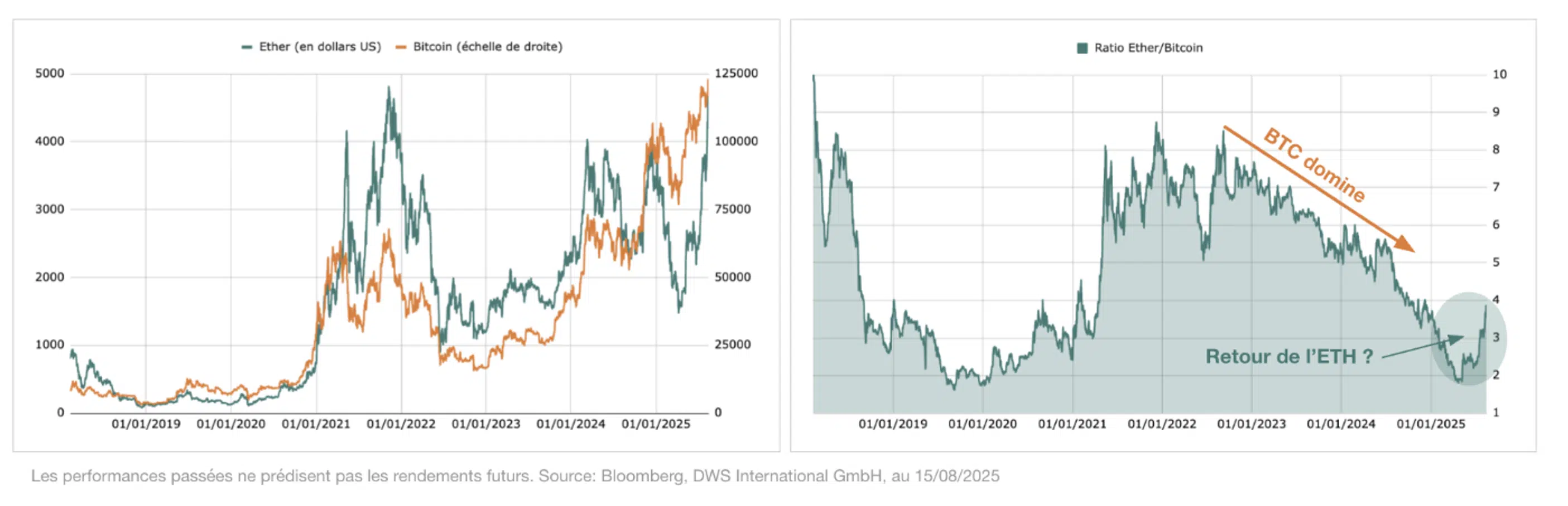 Il y a encore quelques mois, Ether semblait distancé par son grand frère Bitcoin. Mais en un clin d’œil historique, la deuxième plus grande cryptomonnaie revient sur le devant de la scène. À l’occasion du 10e anniversaire de la blockchain Ethereum, assiste-t-on à un véritable comeback ? Qu’est-ce qui rend cette cryptomonnaie si particulière ? Pourquoi est-ce spécifiquement Ether qui bénéficie des évolutions réglementaires aux États-Unis ? Et quel rôle peut-il jouer dans un portefeuille d’investissement ?